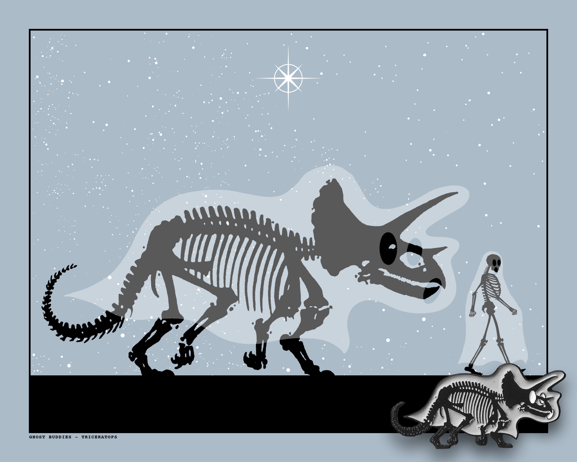 GHOST BUDDIES - TRICERATOPS - mini print - 8” x 10”, 3 colors + ENAMAL PIN - GLOWS IN THE DARK