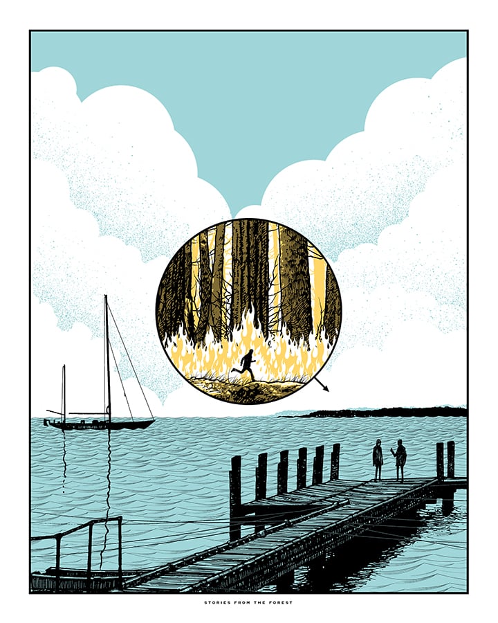 The story of a burning forest inspires someone to destroy a boat. He goes to the city to tell someone. The story of the destroyed a boat inspires someone to deface a building. He goes to the forest to tell someone. The story of the building defacing inspires someone to burn the forest down. He goes to the sea to tell someone.