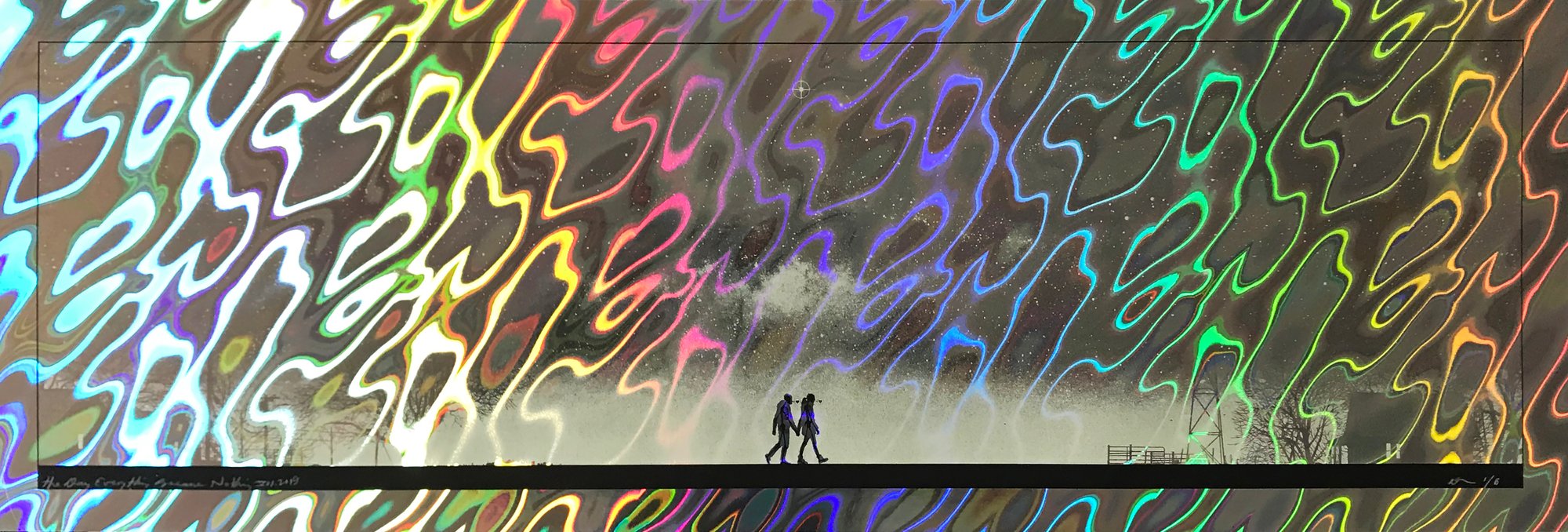 2 color screen print (glows in the dark) 12” x 36” - signed & numbered - Lava Foil Holographic paper - edition of 6 - Designed & Printed by Dan McCarthy - November 2019